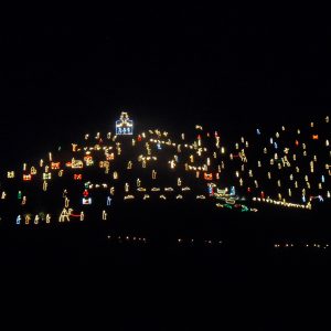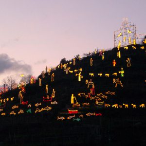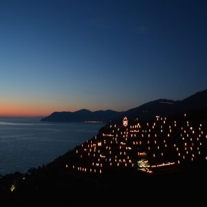 Da ormai cinquantasette edizioni, infatti, nel caratteristico borgo di Manarola, nel cuore del Parco delle Cinque Terre, va in scena uno spettacolo emozionante e unico al mondo. Al calare del sole, la Collina delle Tre Croci s’illumina dando vita a un presepe incredibile, che mischia al suo interno sapienza artigianale e rispetto per le tradizioni, amore per il territorio e una spinta innovativa, che lo fa apparire quasi come un’opera di land art letta in chiave religiosa.